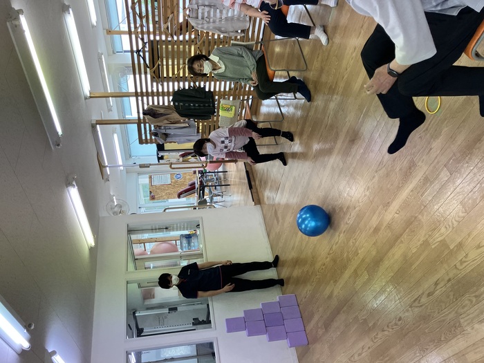 キックでブロック倒し 2025年05月23日(金) キャッチボールの後に毎回的当てを行うのですが、今回はキックで。 座ってボールを蹴ってもらい、ブロックが何枚崩せるかをみんなで競いました。 2回チャレンジしてもらい、中には1回で全て崩してしまう方も。 やっぱり、いつもとは違うことをやると新鮮で楽しいです。