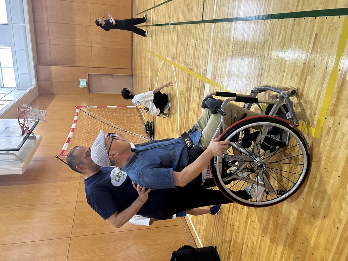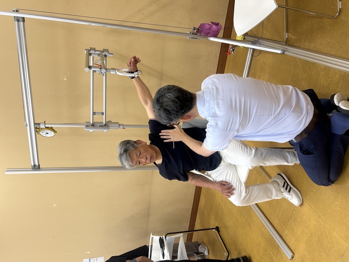 上の2枚の写真は腕や足の重さを無力化してストレッチを行う装置で、日福大の教授さんのオリジナルです。