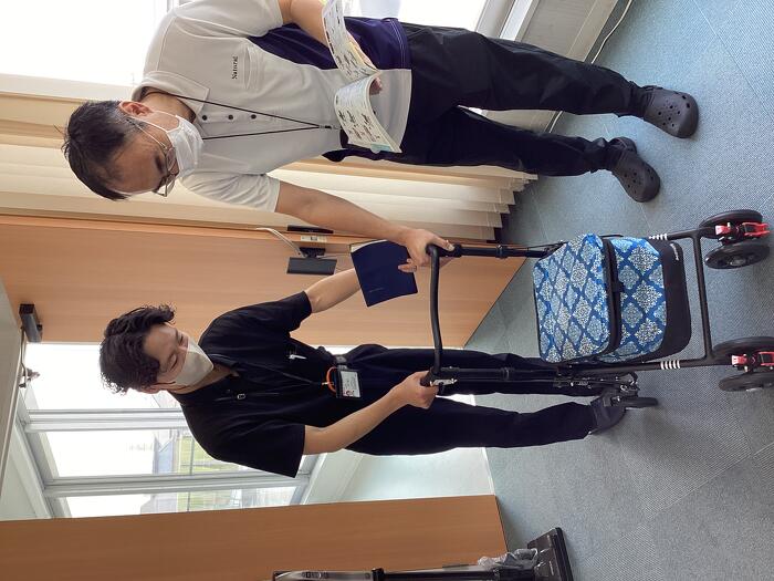 新商品 2025年09月10日(水) 福祉用具事業所のフロンティアさんが新しい歩行器の紹介に来てくれました。 従来のものより軽くてコンパクトで買い物かごもばっちり置けます。 デザインも可愛らしく利用者さんにお勧めしたいと思いました! フロンティアさん、いつも新商品のご紹介ありがとうございます!