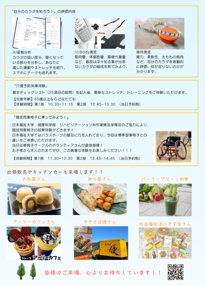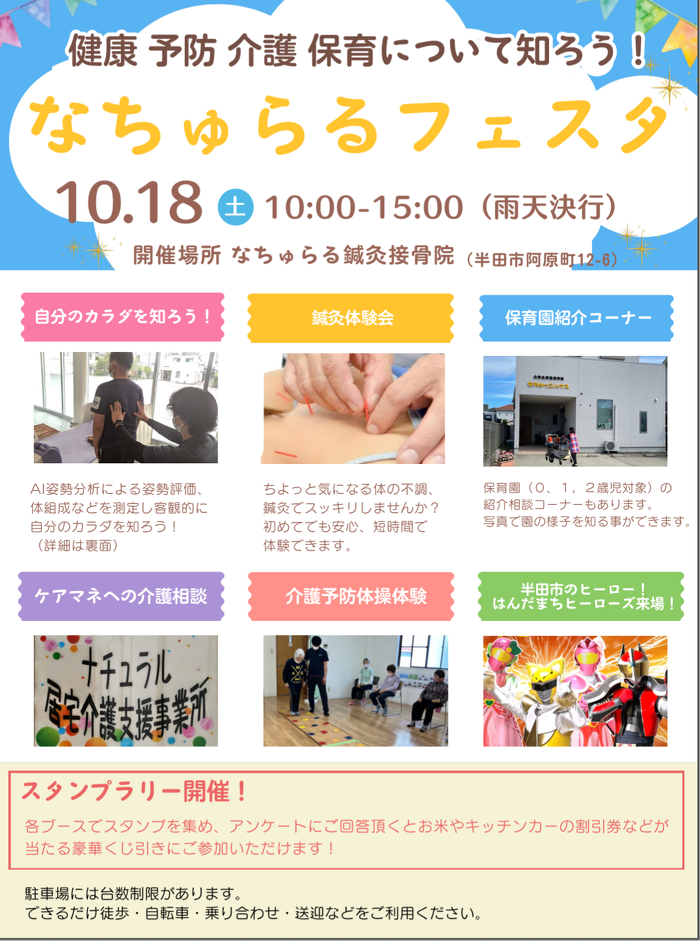 なちゅらるフェスタ 2025年09月22日(月) 10月に阿原町のなちゅらるで「健康・予防・介護・保育について知ろう」をテーマにした「なちゅらるフェスタ」があります。 事業所のブースがあり、各ブースで体験などをしてスタンプを集めアンケートに回答して頂くと豪華賞品がたるくじ引きに参加できます! 居宅介護支援事業所はケアマネジャーが介護相談を行いますので、お気軽にご相談下さい。 皆様のご来場お待ちしております!