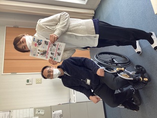 福祉用具事業所のびざんさんが新しい車いすの紹介に来てくれました! 最初からクッションがついているものでとても座り心地が良かったです! 他にも角度・高さの調整が可能で使いやすかったです^_^ 2階の事務所まで重たい車いすを運んで下さりありがとうございました♪