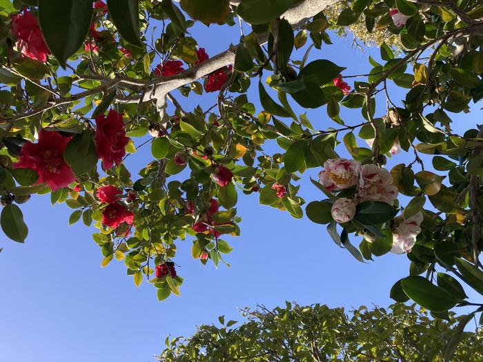 山茶花 2024年03月18日(月) 早いものでもう春の訪れを感じる季節になりました。武豊の接骨院なちゅらるの山茶花が見頃です。山茶花は秋から冬に開花するようですがここでは今が満開で、一本の木から枝ごとに赤と白の花が咲いています。