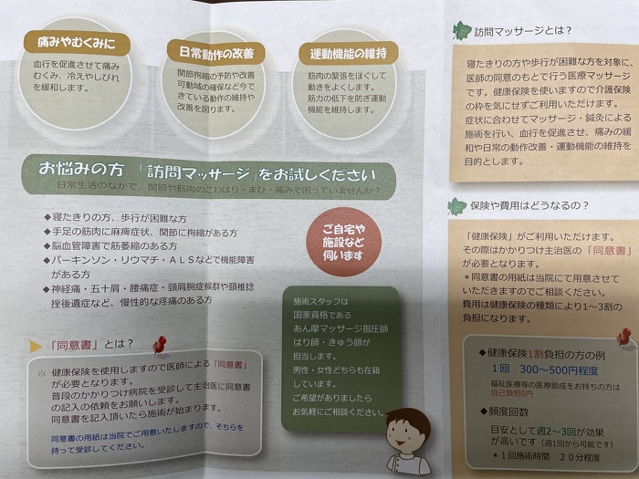 訪問のご案内 2024年08月07日(水) 訪問鍼灸、マッサージのご案内です。 外出が困難な方で、かかりつけ医の同意書が頂ければ訪問可能となります。詳しくはお問合せ下さい 0569201155 訪問鍼灸マッサージとお伝え下さい