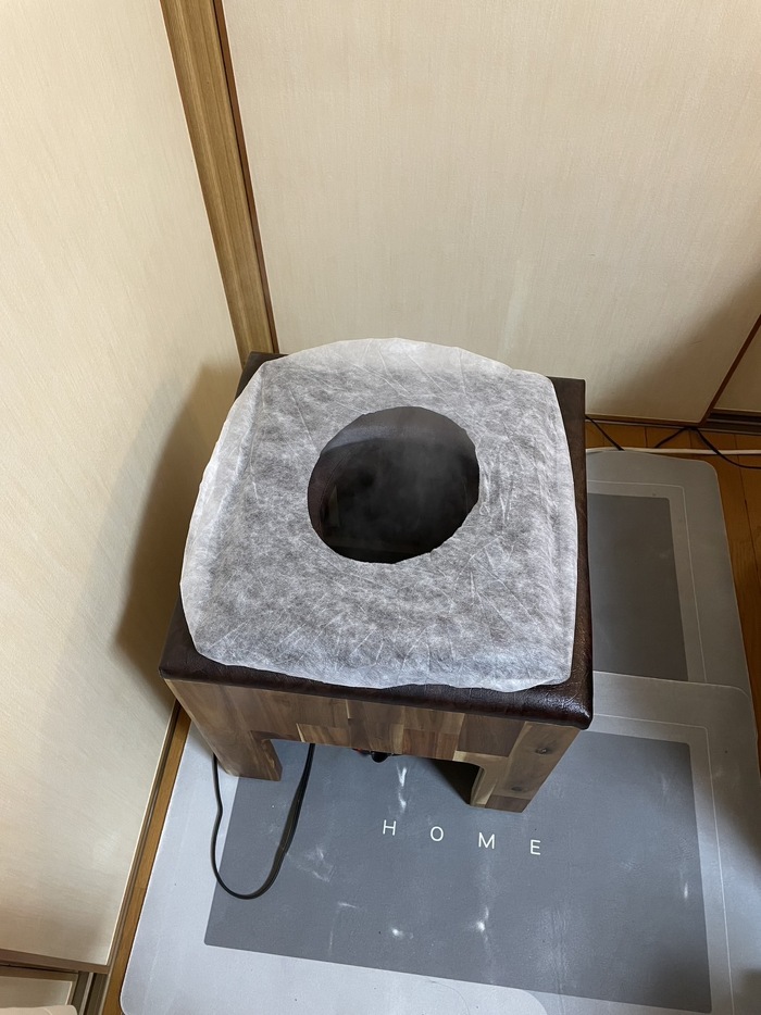 よもぎ蒸し 2024年10月09日(水) よもぎ蒸しを知っていますか? 穴の開いた椅子に座り、下からヨモギの湯気が上がってきます。 利用者さんは全身を覆うフードをかぶってその椅子に30分ほど座って体の芯から温まることの出来る方法です。 冷え症改善やダイエット、疲労回復に効果があります。