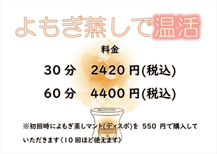 武豊町にある接骨院なちゅらるで、よもぎ蒸しを始めました。