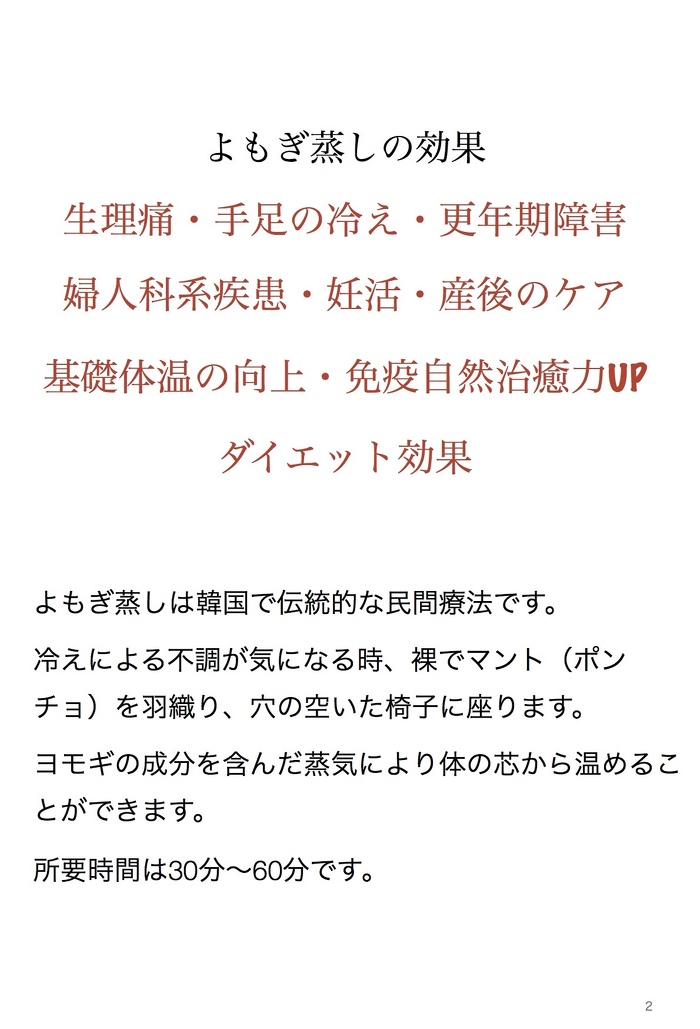 よもぎ蒸しの効果 2024年12月11日(水) 以前にも載せましたが武豊町にある接骨院なちゅらるで『よもぎ蒸し』を始めました。 個室で30分か60分ゆっくり座って過ごしてもらうだけです。 これからの次期で冷え症の対策として、産後のケアや妊活を考えている方にお勧めします。 接骨院にかからなくて、よもぎ蒸しだけをしに来て貰っても大丈夫です。 やってみたい方は接骨院なちゅらるに電話予約をお願いします。 料金は30分 2,420円 60分 4,400円 です。初回はマント(ディスポ)550円もいただきますので、よろしくお願いします。