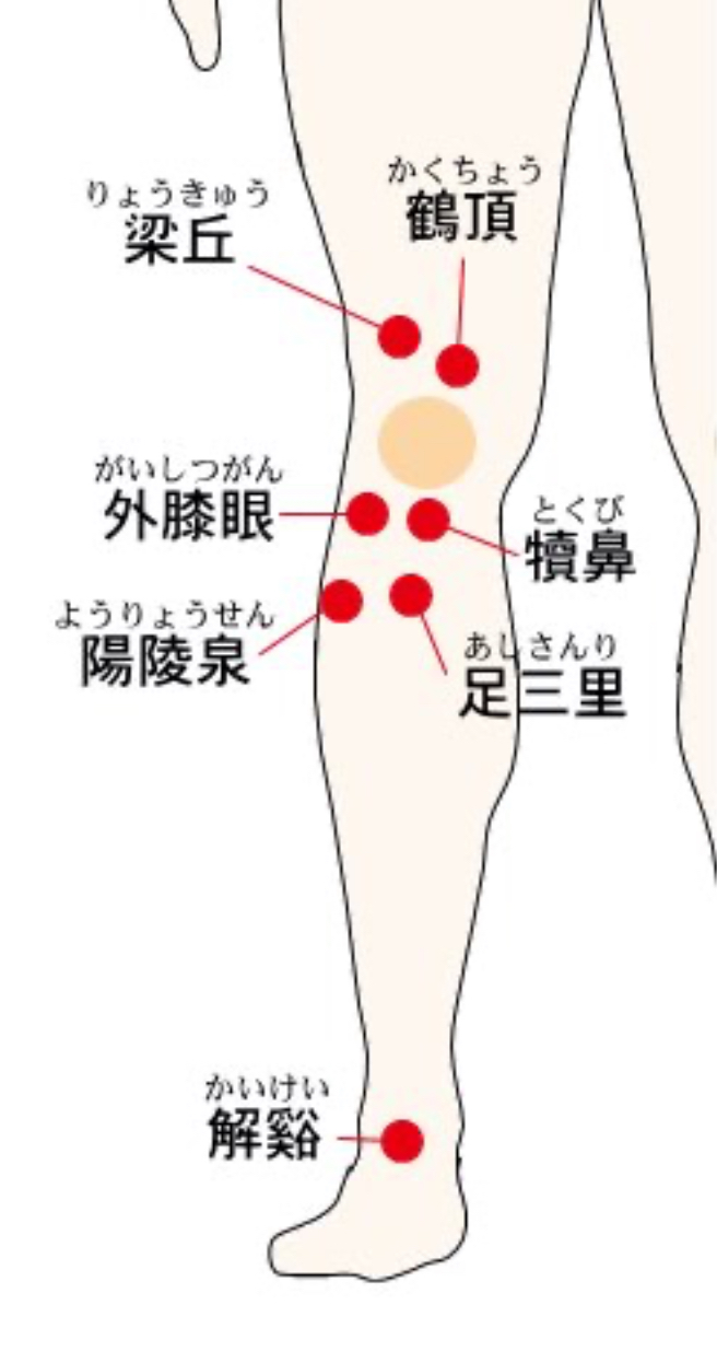 当院では膝の周りの犢鼻穴・梁丘穴・膝眼穴・委中穴をはじめ患者さんの状態に合わせて鍼灸を行っています。