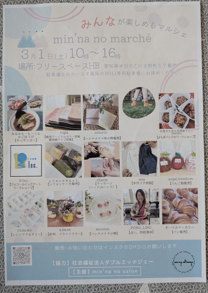 ✿マルシェのお知らせ✿ 2025年02月17日(月) こんにちは! 看護師の保です! 皆様は、体調等お変わりありませんか? 今回は、マルシェのお知らせです。✨ 利用者様より、教えて頂いたのでこちらで紹介させていただきます♥ 日時:3月1日(土)10:00~16:00 場所:フリースペースHB 愛知県 半田市 乙川吉野町67番地 チラシを載せたので、下記の写真をご参照ください!!! 魅力的な出店ばかりですね~✨ ご都合がよろしければ是非立ち寄ってみて下さい♥ 最後までお読みいただきありがとうございます。 次回のブログもおたのしみに。♥